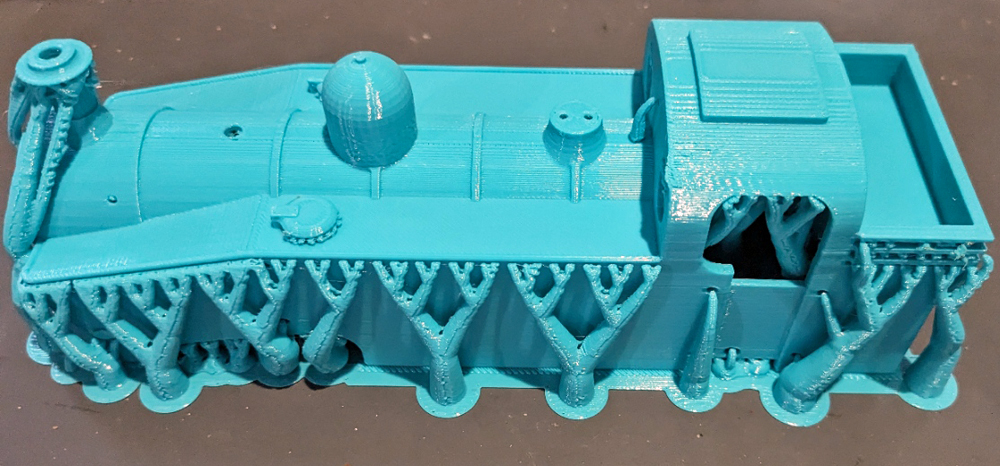 Post processing time of this train boiler with Grid supports was almost 2 hours and gloves are needed. Very easy to get cut. There is a lot of supports to remove and they don't remove easily even in PLA. The longer to remove the supports, the more chance of damaging the part. I printed the part on an MK4 in PETG using organic supports and it took 15 minutes to remove the supports. No damage to the part or my hands.