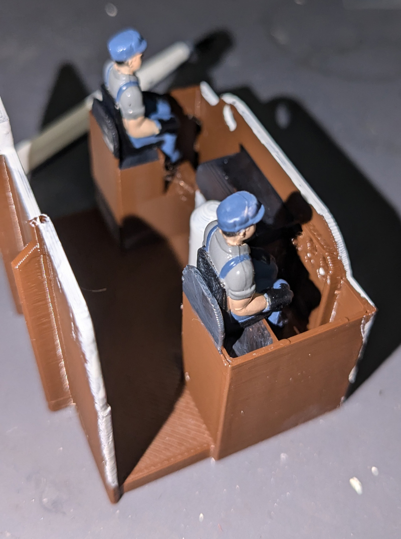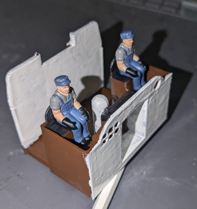The interior painted with engineers installed. Ready for installation. Don't get too carried away on the detail. Small details really aren't visible. My engineers had seat pads built in making them sit a little tall. Trimming them down to their own seats will make them just right in the interior.