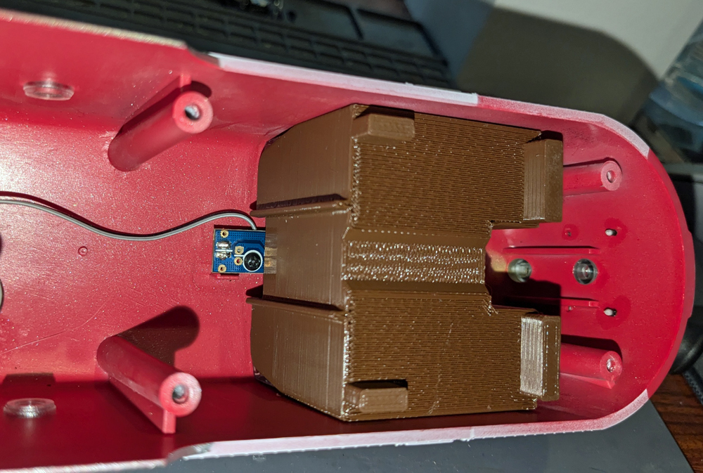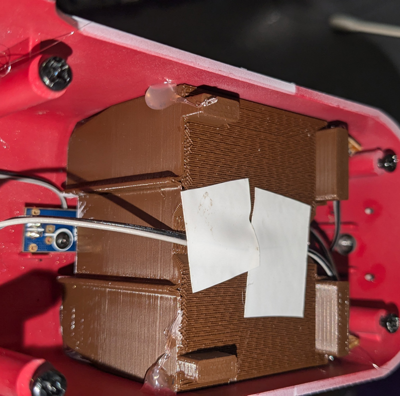 The Holder I made for the Buck-convertor. The holes in the buck convertor at 21mm x 46mm pattern. You can bolt it or use double back tape to keep it on the frame. I used bolts. This can be scaled to fit your Buck convertor. Holes are for 2mm or .08 diameter bolts, 6mm/1/4" thread max. Buck-convertor-holder .stl/.stp files. The strings from FBM printing clean up easily.