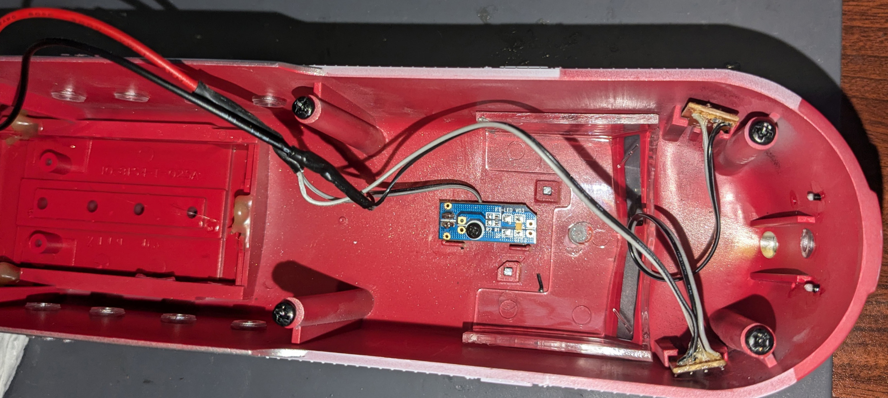 The interior light is separated from the marker lights. The lead isn't long enough if left connected. Then the interior light and marker lights are wired into the pigtail. Gray wire is positive. The interior light board is held with a 2mm screw. If you add the headlight, it would also be wired in here.