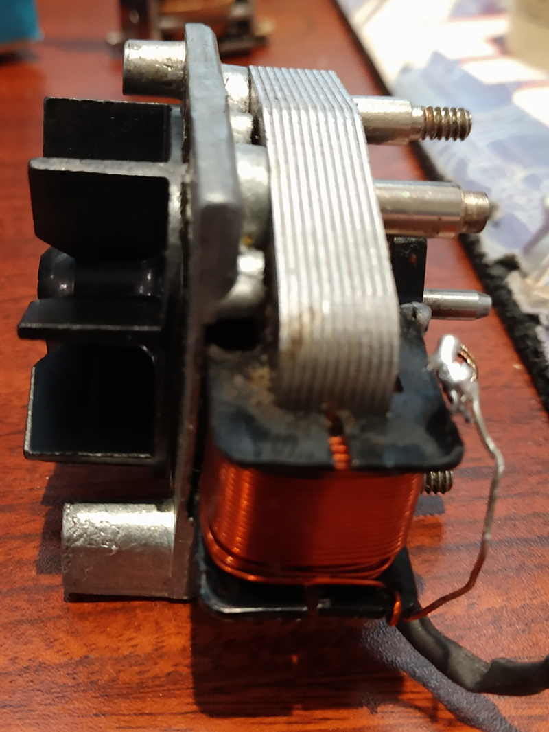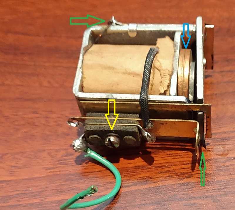 Look at the relay overall. Is there rust or a an oxidize film. This may interfere with the relay working or making good contacts. Green arrow above shows where the plate contacts the body when active. This needs a good electrical contact. I have had to use a small wire brush to clean on the gap where the green arrow is pointing, mostly on the top. To help get a good contact. On the bottom of these tabs there are delicate copper tabs, be very careful.