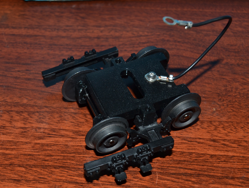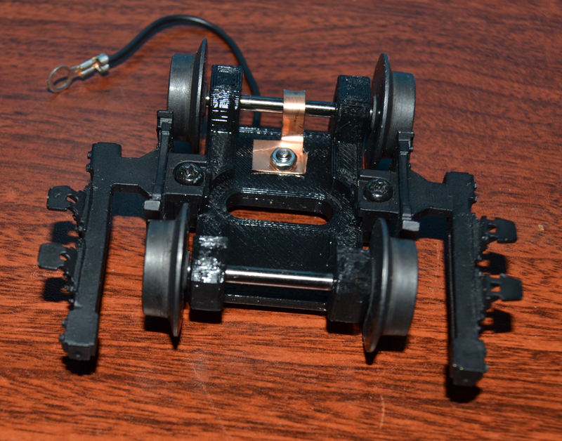 When done the original wheels and details were attached.  The plastic will not conduct electricity, I added a copper strip to one of the wheels and used a 2mm x 6mm bolt and nut to attach the copper wire to the ground strap.   This is what it looks like before assembling to the engine.