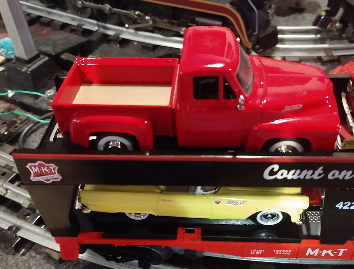 I have a MKT 4223 car carrier from LOTS, Lionel Operating Train Society. It looks great with 1950's for Pickups and 1956 T Birds. I needed some wheel chocks to hold the autos on the transport.