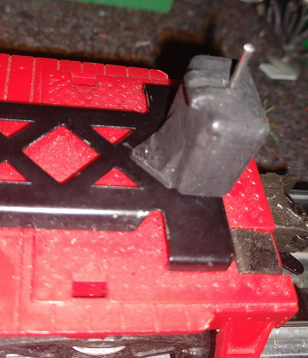 On to a more modern 16330 trailer. These trailers have a 6mm or 1/4" hole for the "king pin". There is a small hole .125" or 3mm hole in the center along with the .4"/10.16mm hole for the truck rivet on both ends of the trailer. I decide to use these holes for orientation. Also to press fit into the truck rivet hole to hold the mount in. No glue no fuss. If you want to remove it later, just pull it out with a little force.